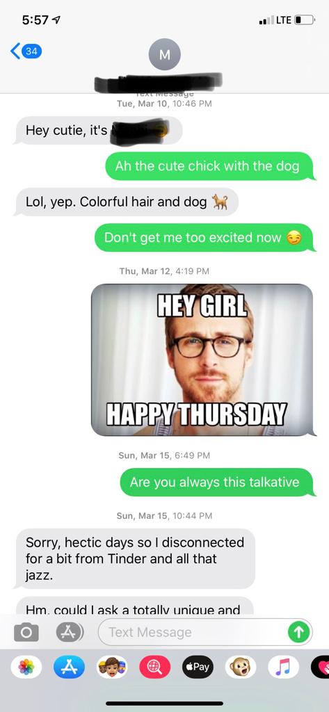 I recently analyzed dozens of my conversations, and realized that in about 2/3 of them i had to double text at least once. Had I not been willing to do that, i would have missed out on the majority of my hookups…and even relationships. Here is an example
