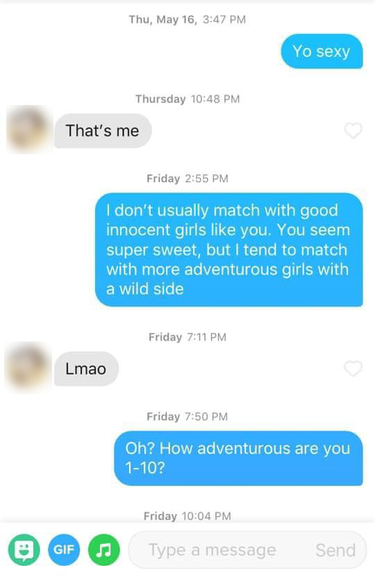 This category is my favorite since you basically have nothing to lose and you’re going high risk with the girl. The downside is that she gets bitchy and she yells at you, calls you a creep, and blocks you. Best done over text (and not directly on your dating app of choice) to avoid getting banned 😉