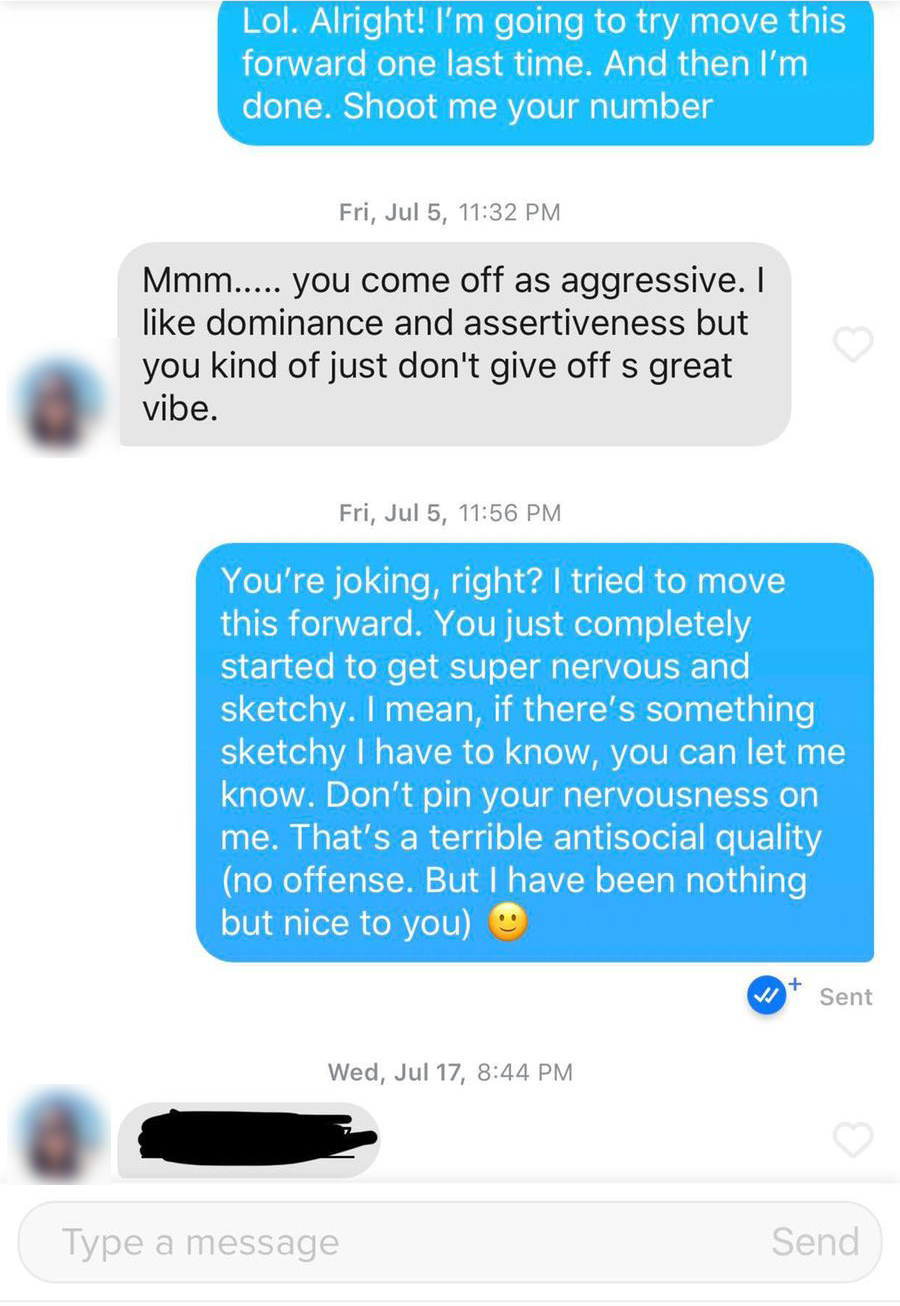 - She is going to get called out on it hardcore. We don’t take that lightly 😉 “You’re joking, right? I tried to move this forward. You just completely started to get super nervous and sketchy. I mean, if there’s something sketchy I have to know, you can let me know. Don’t pin your nervousness on me. That’s a terrible antisocial quality (no offense. But I have been nothing but nice to you) :)”