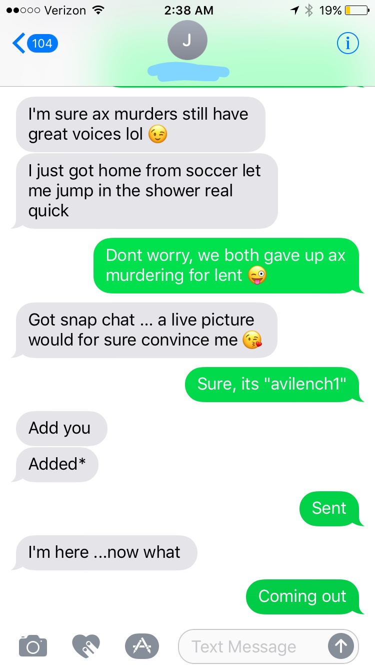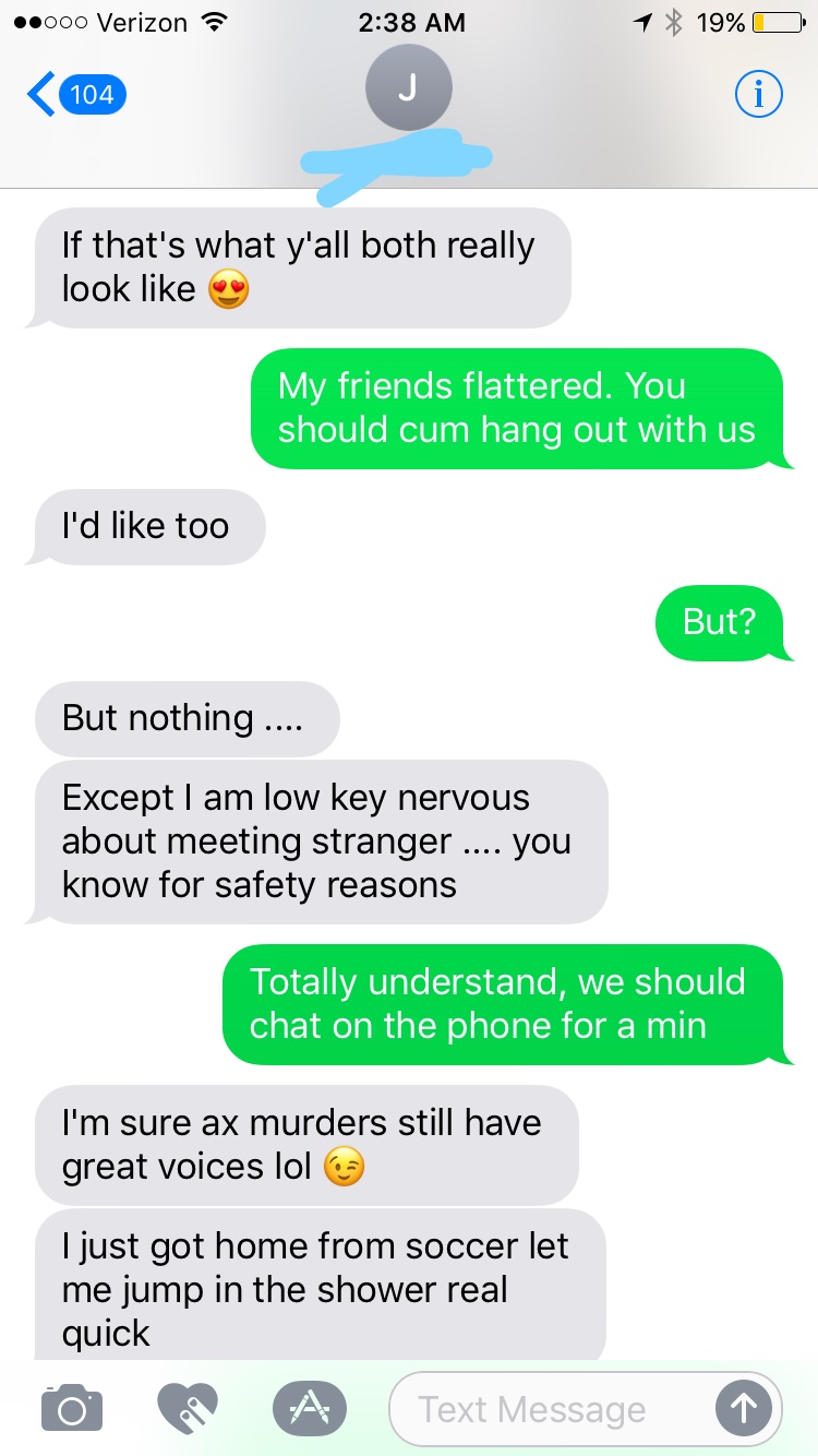 She gives the “what if you are a murderer” concern. Very common. The best response I found for that is reassurance with humor, but telling her that “She’s good, because I gave up (murder/kidnapping/organ selling/etc) for lent”. However, followed up by her next response it is clear that her concern isn’t actually safety but actually getting cat fished. She insists on snapchat and me and my “main girl” take a picture together.