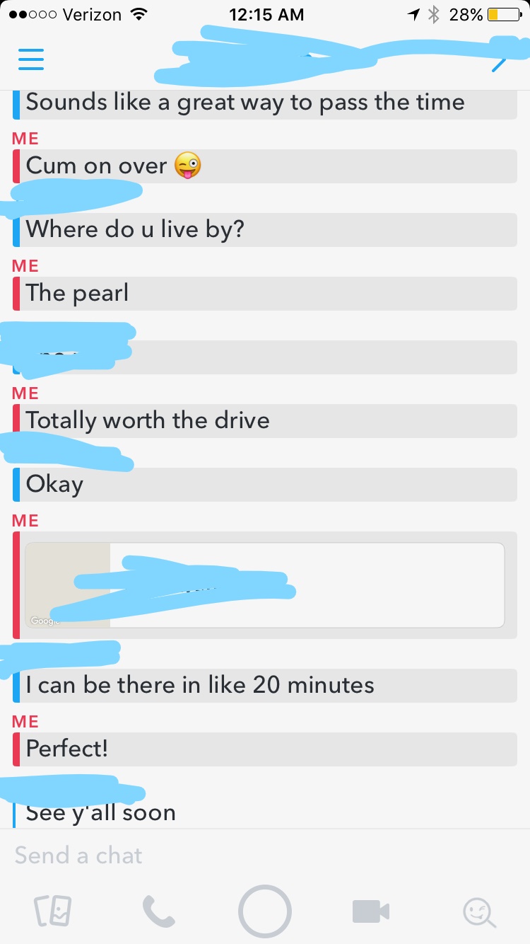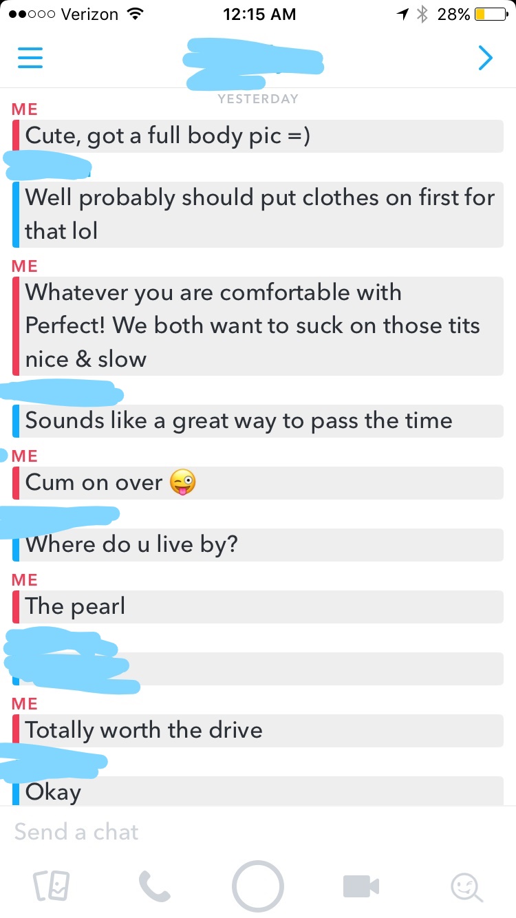The screenshots from snap chat as always came out incomplete, but basically I open her with a snap pic of both of us. Then she responded with a snap of her face. My “main girl” was into it, but I was a bit worried about getting secret fattied so I asked for a body pic. She sent a body pic that showed off her tits and I responded with “Perfect! We both want to suck on those tits nice & slow”. The rest is pretty straight forward. I tell her to “cum on over” and we just coordinate logistics