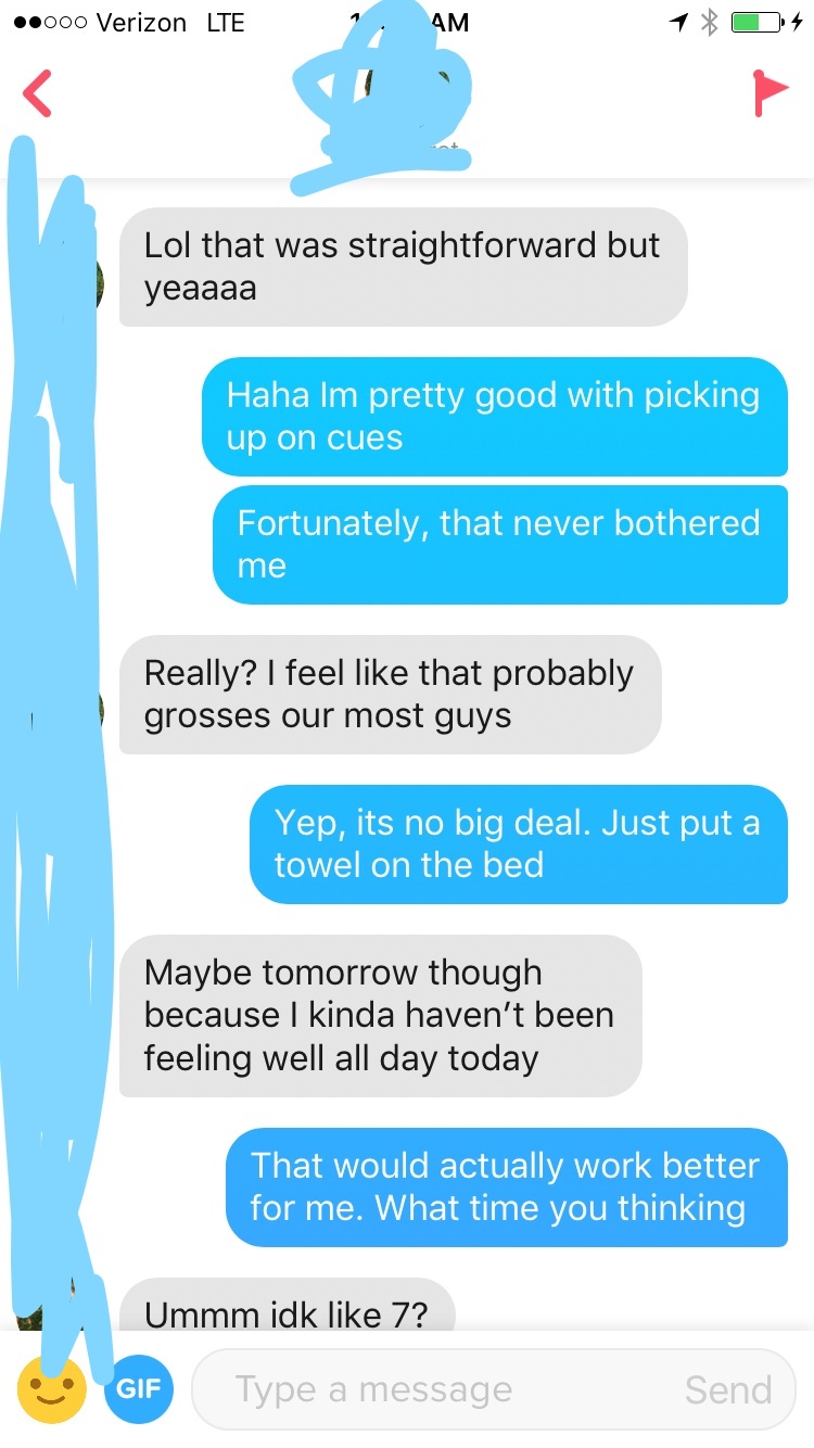 She responds by telling me that it sounds good, but that she “can’t hang out this weekend”. A lot of guys might be confused by this, but after years in the game I know it likely means she is on her period. Why else would she be “bored at home”, but “not able to hang out”. I respond by asking her this in a playful way.