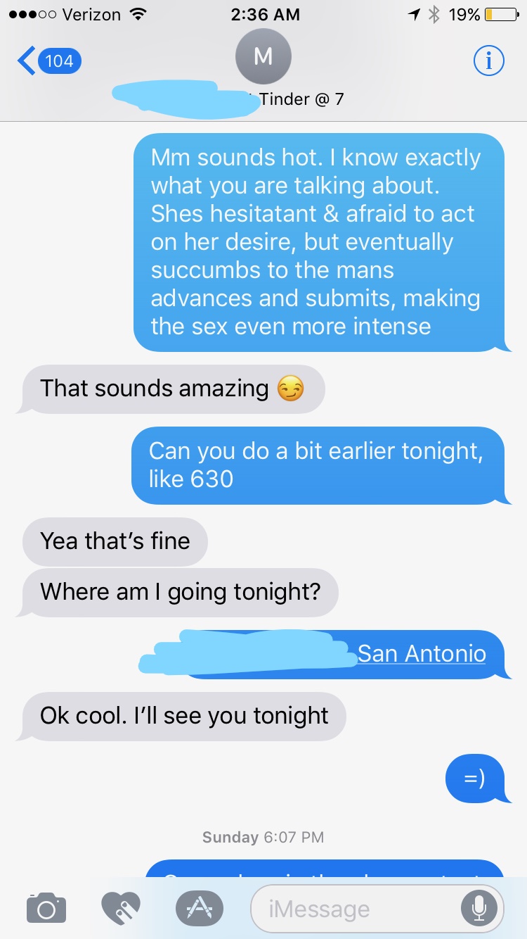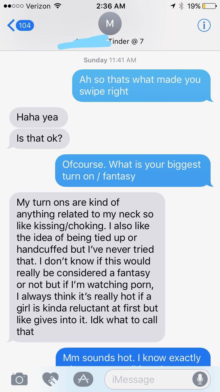 She references that I have “BDSM” written in my bio and I pick up on that. I then ask her another one of my favorite questions “What is your biggest turn on /fantasy”. A lot of girls will really open up when you ask them that (assuming this has already been framed as a sexual encounter). And voila, it works perfectly here.