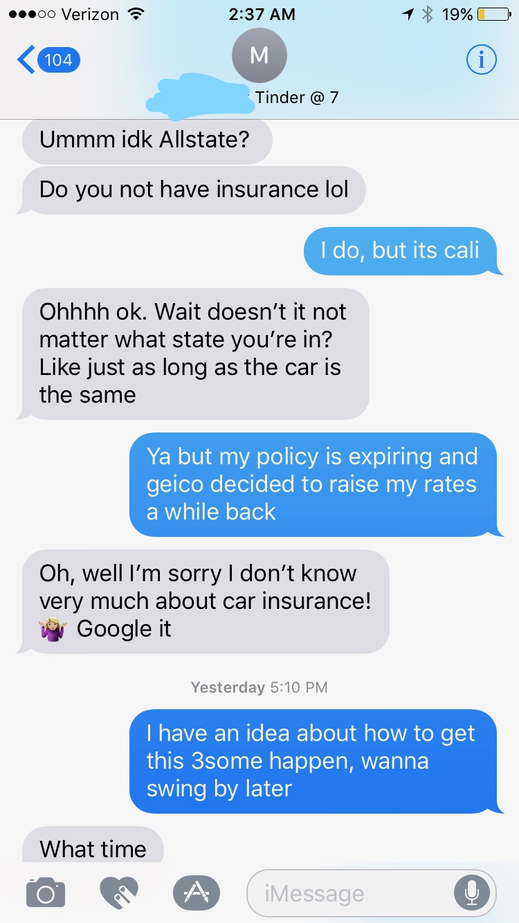 Just some car insurance talk so ignore that. I just wanted to show you guys everything. At the same time, I had also been trying to set up the threesome with other girls I was talking to on tinder.