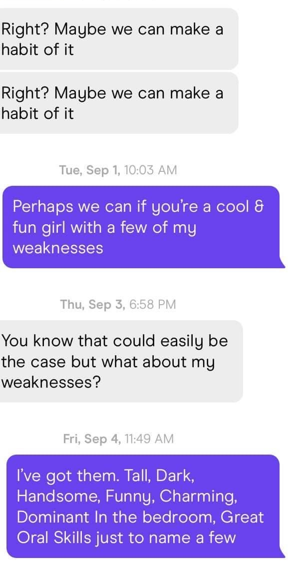 - He cleverly baited that he’s cooking food shirtless and she wanted to check him out. “Oh dang” (Compliment) followed by “You should send pics” (Double text in a matter of 4 minutes)